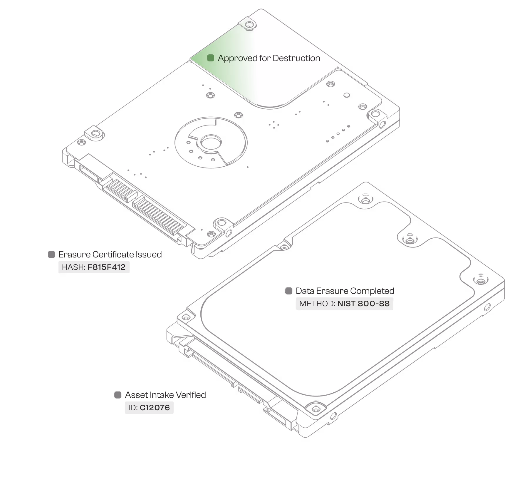Secure data erasure using NIST 800-88 compliant software with multiple overwrite passes. Ideal for functional devices being remarketed. Provides detailed verification reports and certificates.