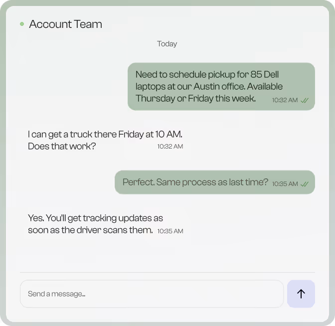 Schedule pickups, request quotes, and communicate with your dedicated account team directly through the portal. Streamline workflows and eliminate back-and-forth communication delays.